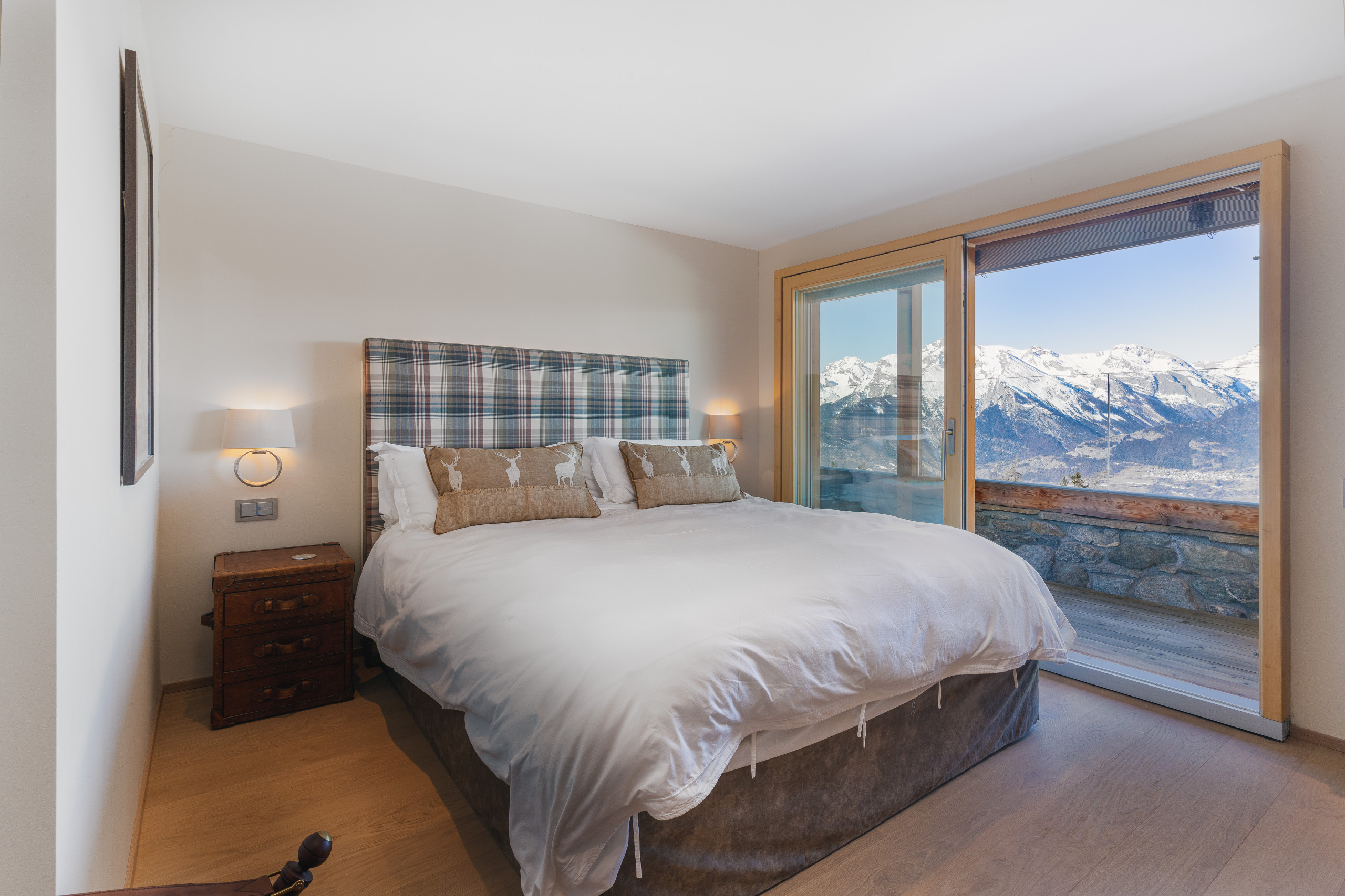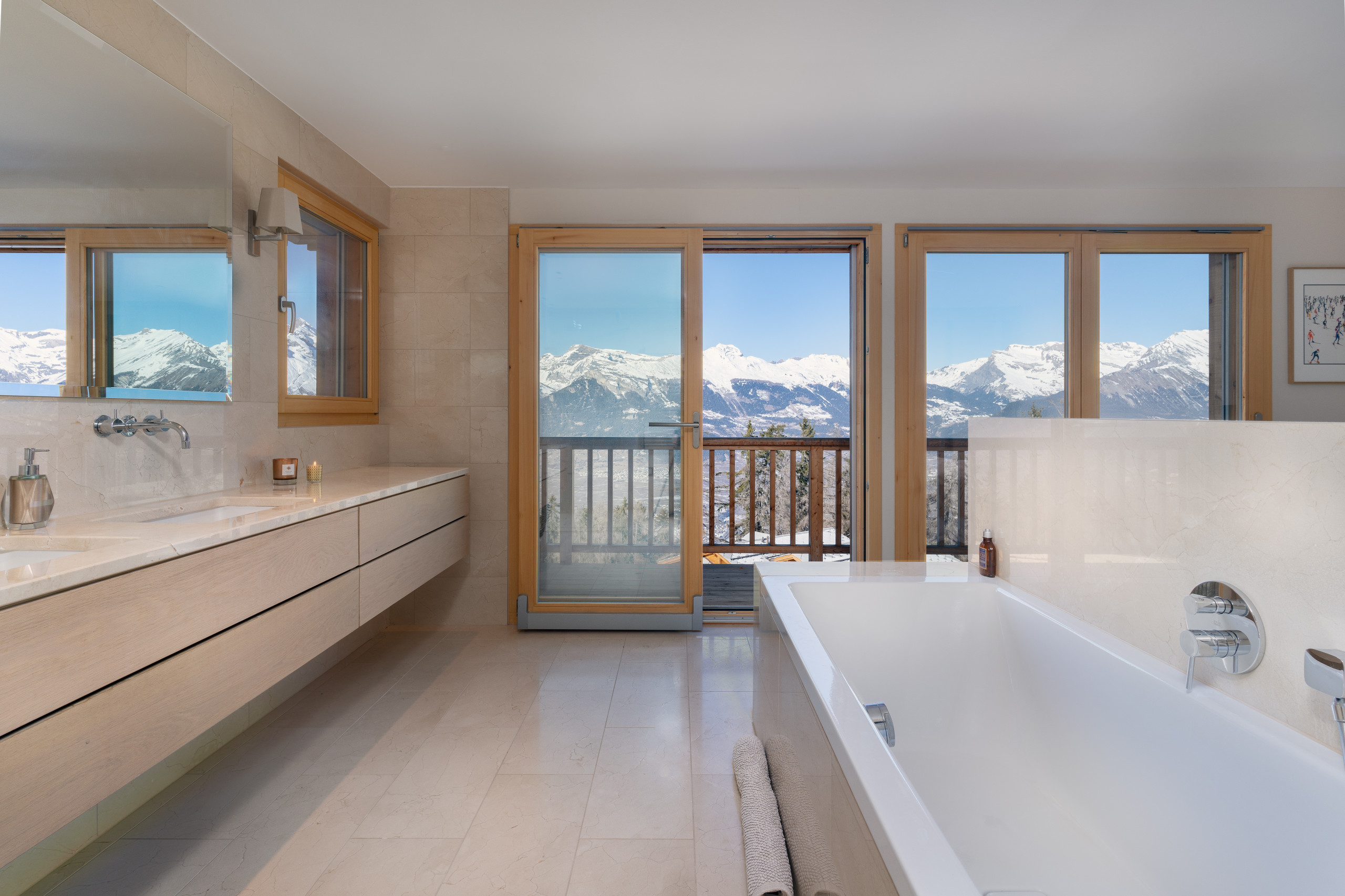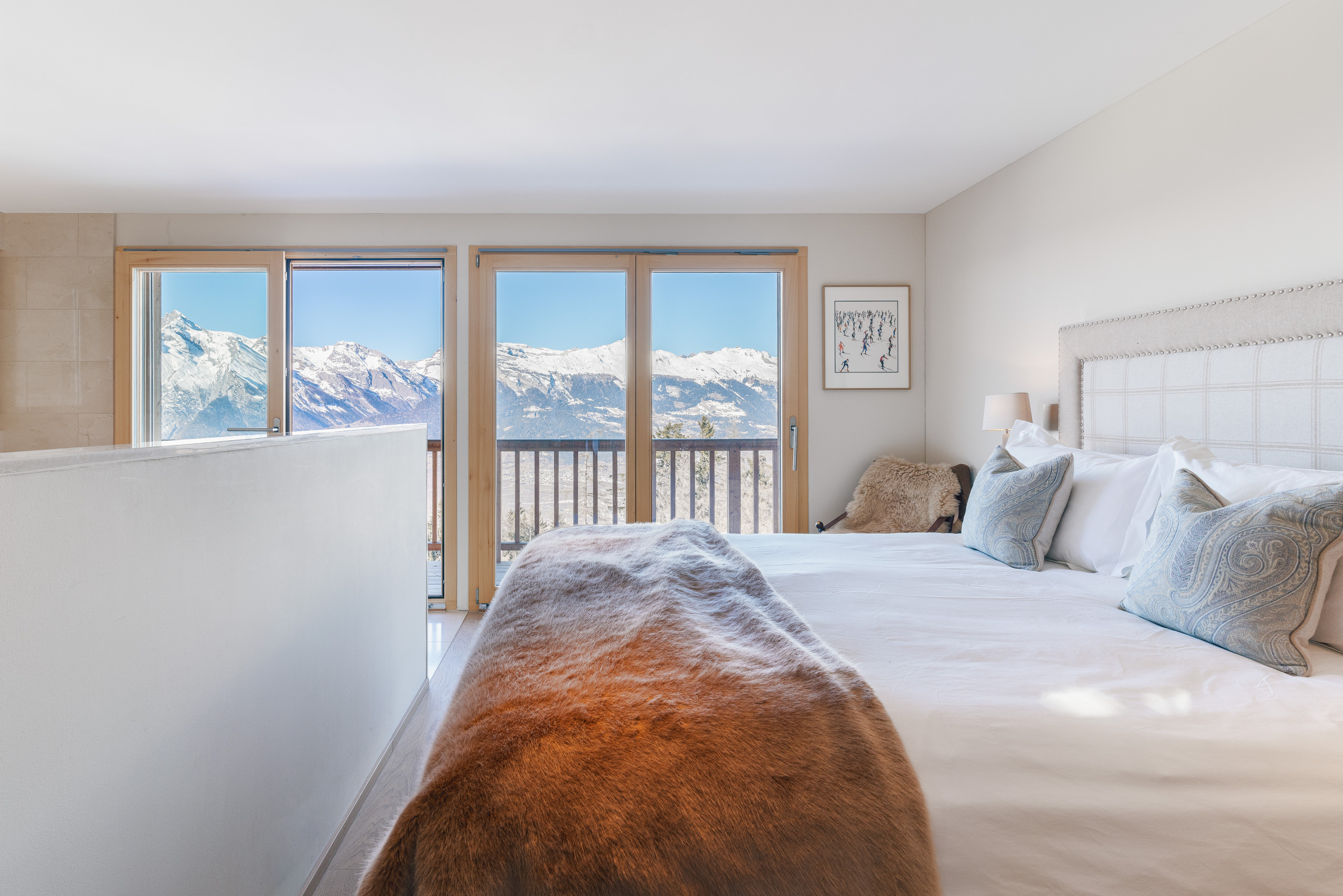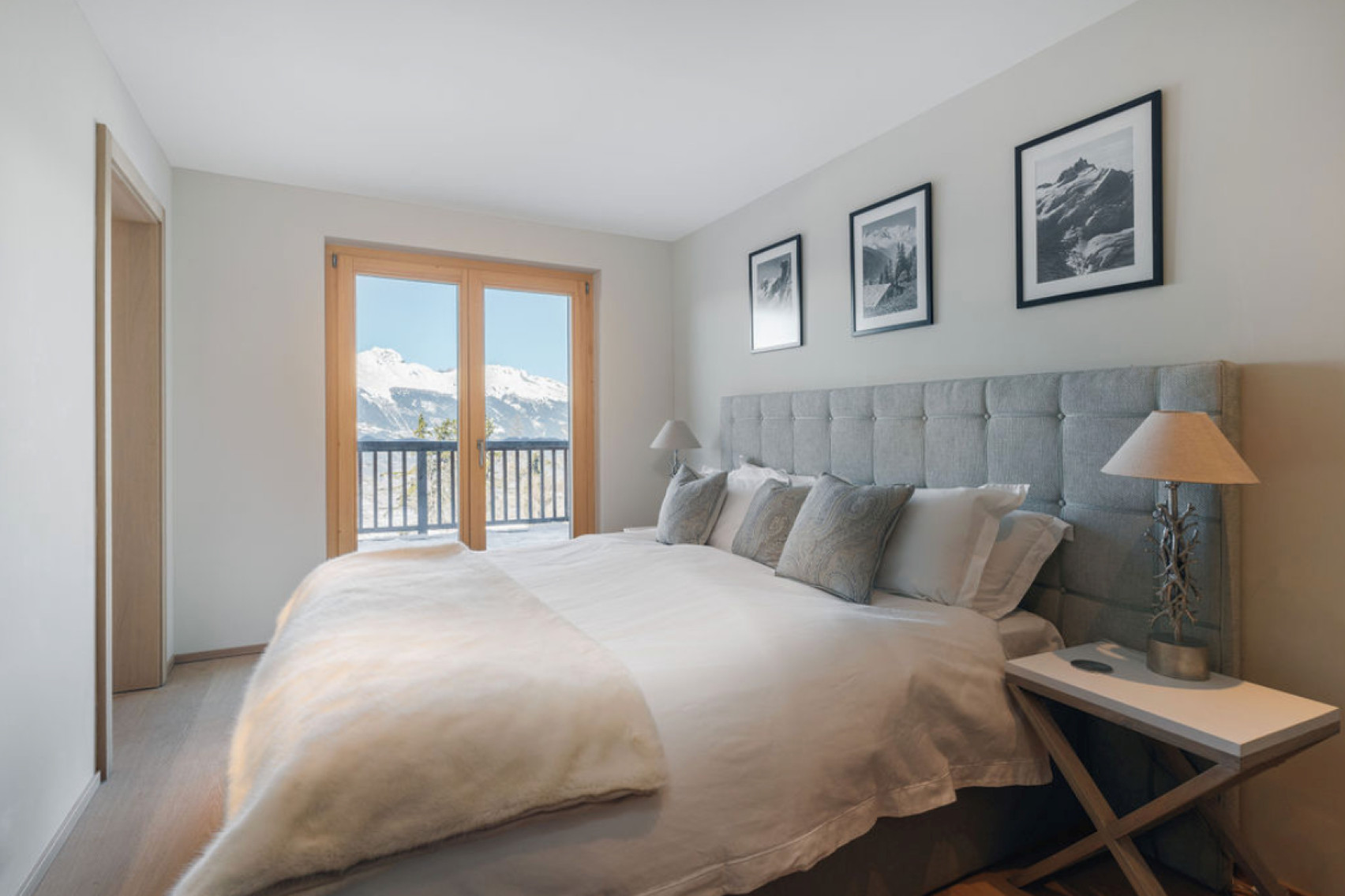 Die unteren Ebenen beherbergen die wunderschön eingerichteten Schlafzimmer, darunter zwei Hauptsuiten, die jeweils mit zeitgemäßen, steinverkleideten Badezimmern ausgestattet sind - perfekte Rückzugsorte nach einem Tag in den Bergen, sei es im Winter oder Sommer.