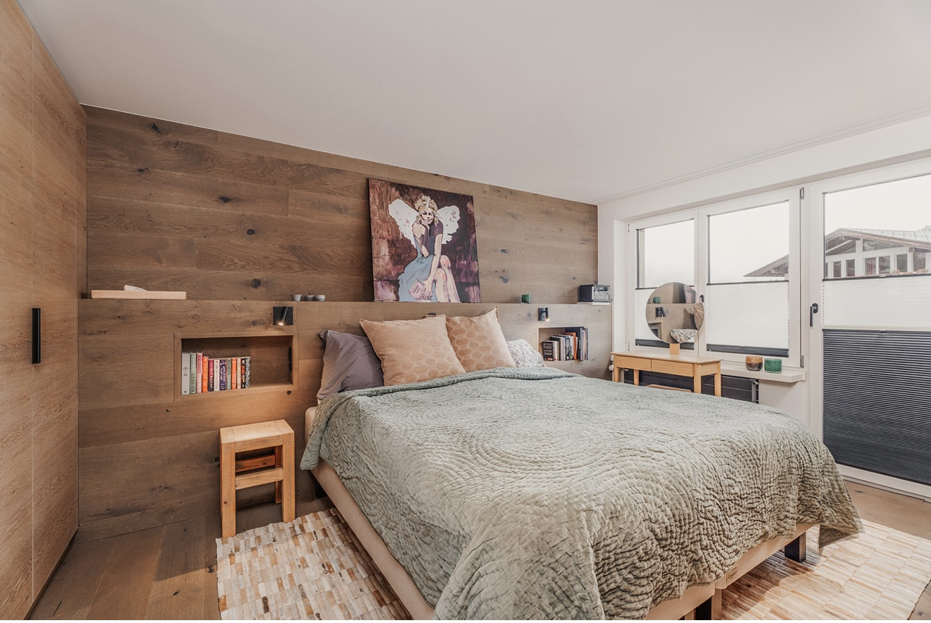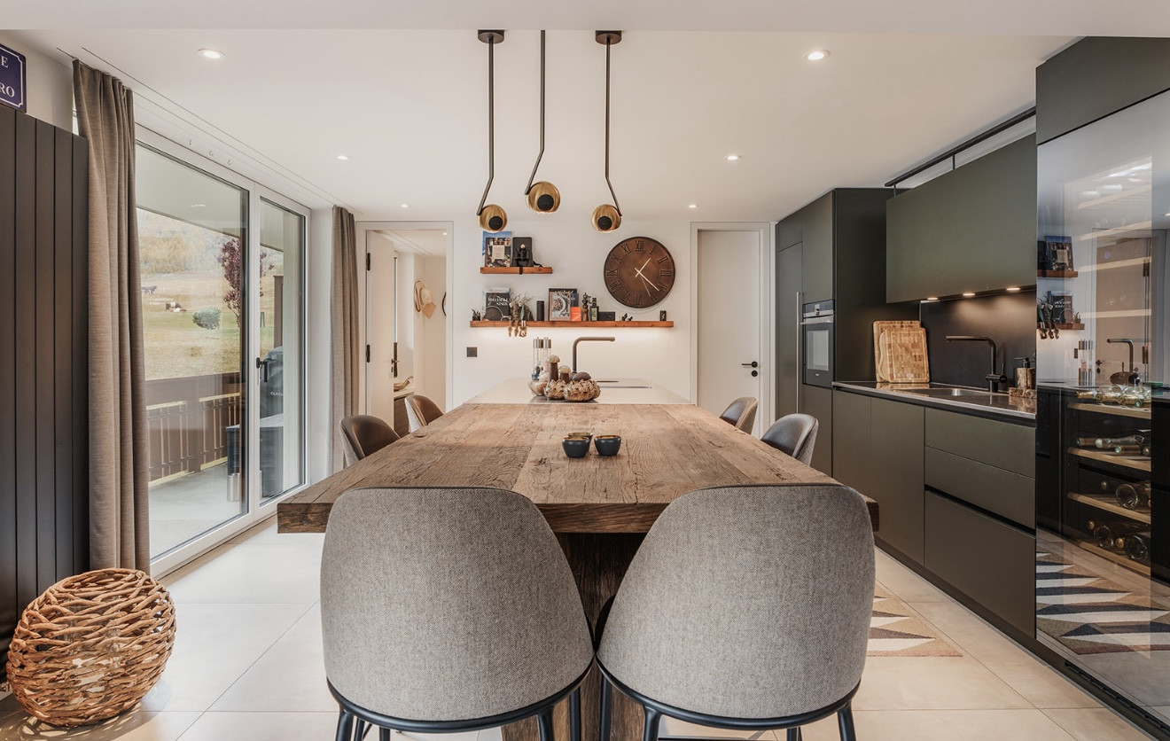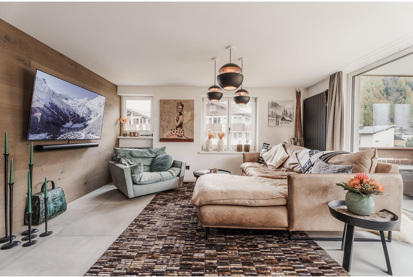 Mit einer Fläche von 106 m² wurde die Wohnung umfassend auf fünf Sterne-Niveau renoviert. Die Innenräume verfügen über eine maßgefertigte Pollinger-Küche, individuell gefertigte Schreinerei und zeitgenössische Beleuchtung, die Schweizer Präzision mit warmem Alpencharakter kombinieren.