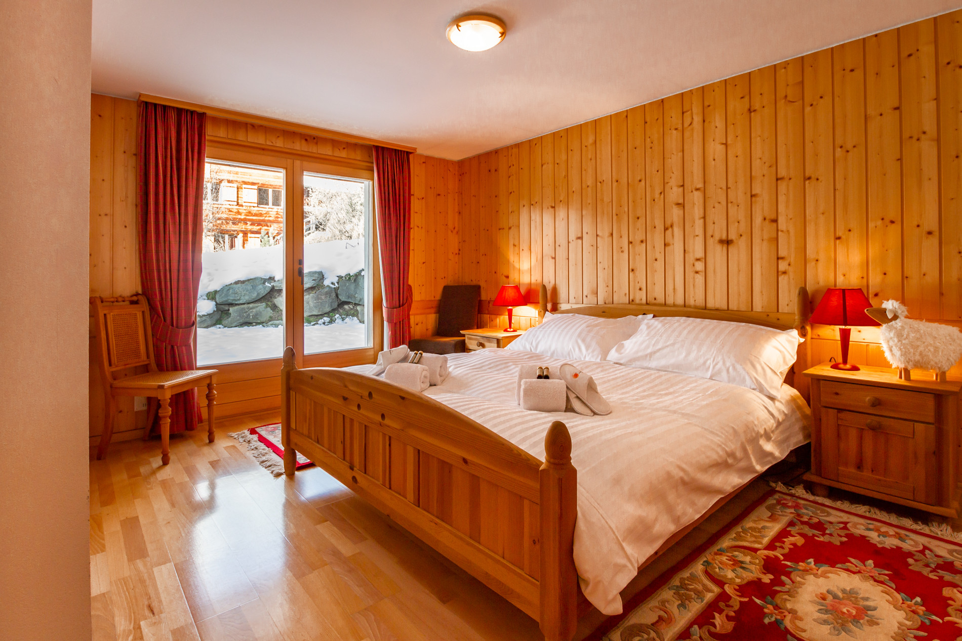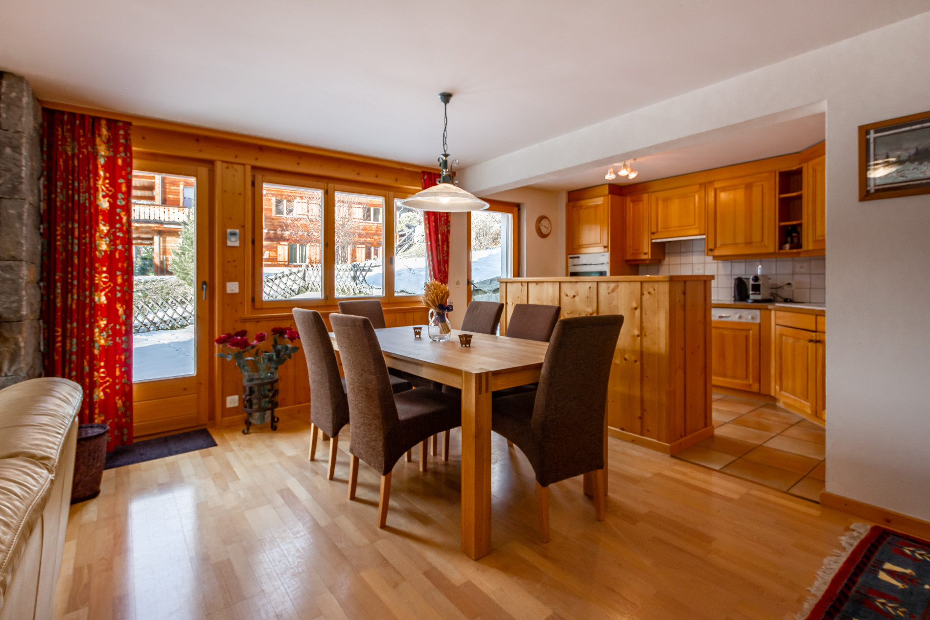 Diese Wohnung mit drei Schlafzimmern und einem Badezimmer befindet sich im zweiten Stock eines traditionellen Schweizer Chalets mit gesamt drei Ferienwohnungen.