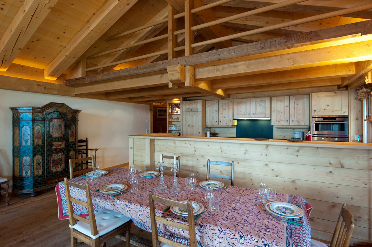 Der großzügige, offen gestaltete Wohnbereich verfügt über eine offene Küche mit Blick auf einen großen Esstisch. Große Fenster lassen viel Tageslicht herein, während eine französische Tür auf einen nach Süden ausgerichteten Balkon führt – ideal für Mahlzeiten im Freien oder zum Sonnenbaden mit Panoramablick auf das Tal und die Combins.