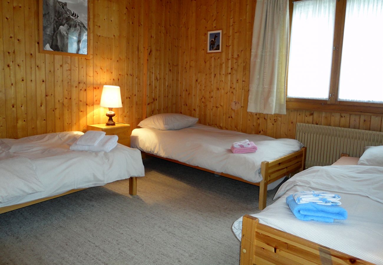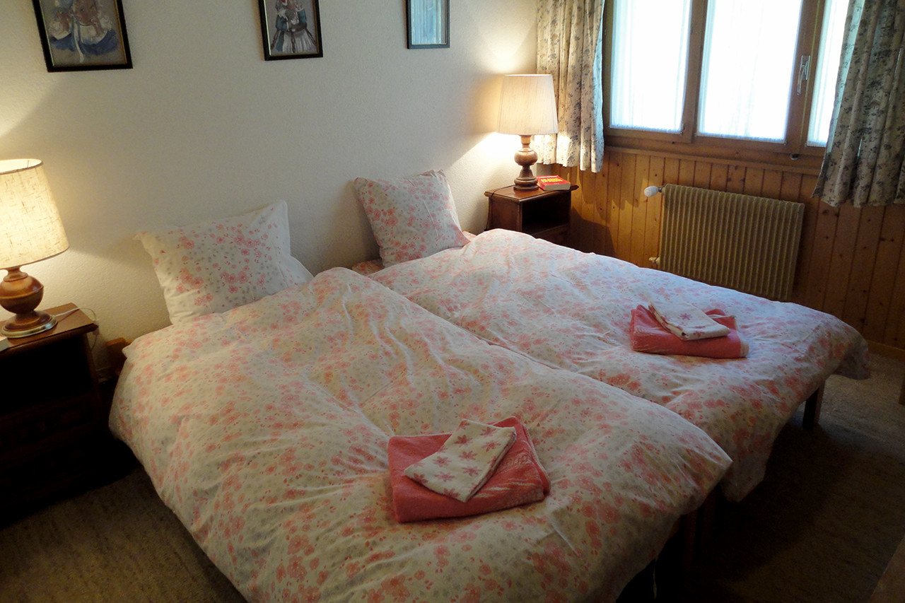 SOLEIL DES ALPES 05 liegt im oberen Erdgeschoss und verfügt über drei Schlafzimmer mit total sieben Schlafplätzen und zwei Badezimmern. Der sonnige, nach Süden ausgerichtete Balkon der Wohnung lädt die Gäste ein, die spektakuläre Aussicht über die Alpen von ihren Sonnenstühlen aus zu geniessen.