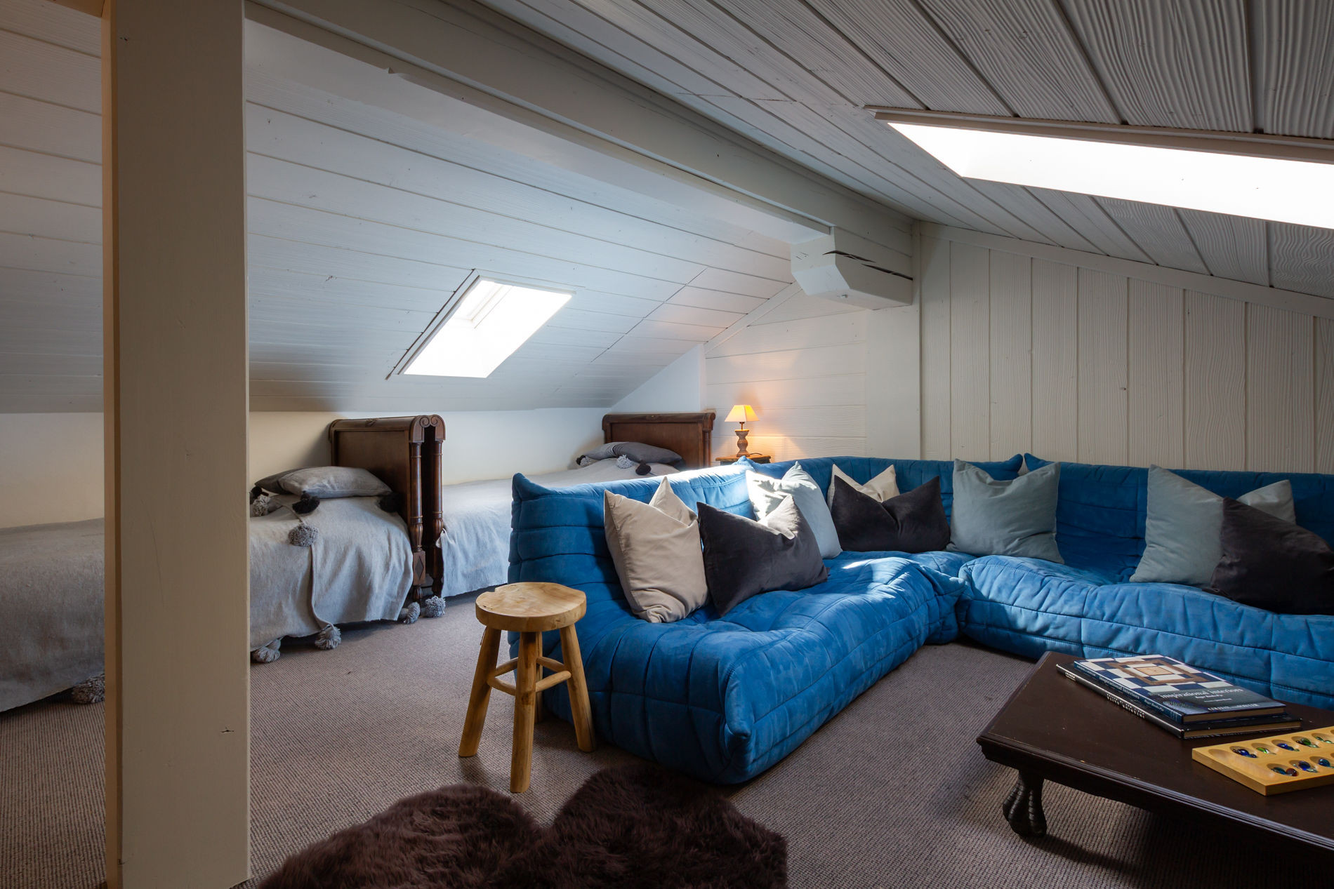 Über eine kleine Treppe gelangt man zur der Mezzanine, wo eine gemütliche TV-Ecke mit Sofas zum Entspannen einlädt.