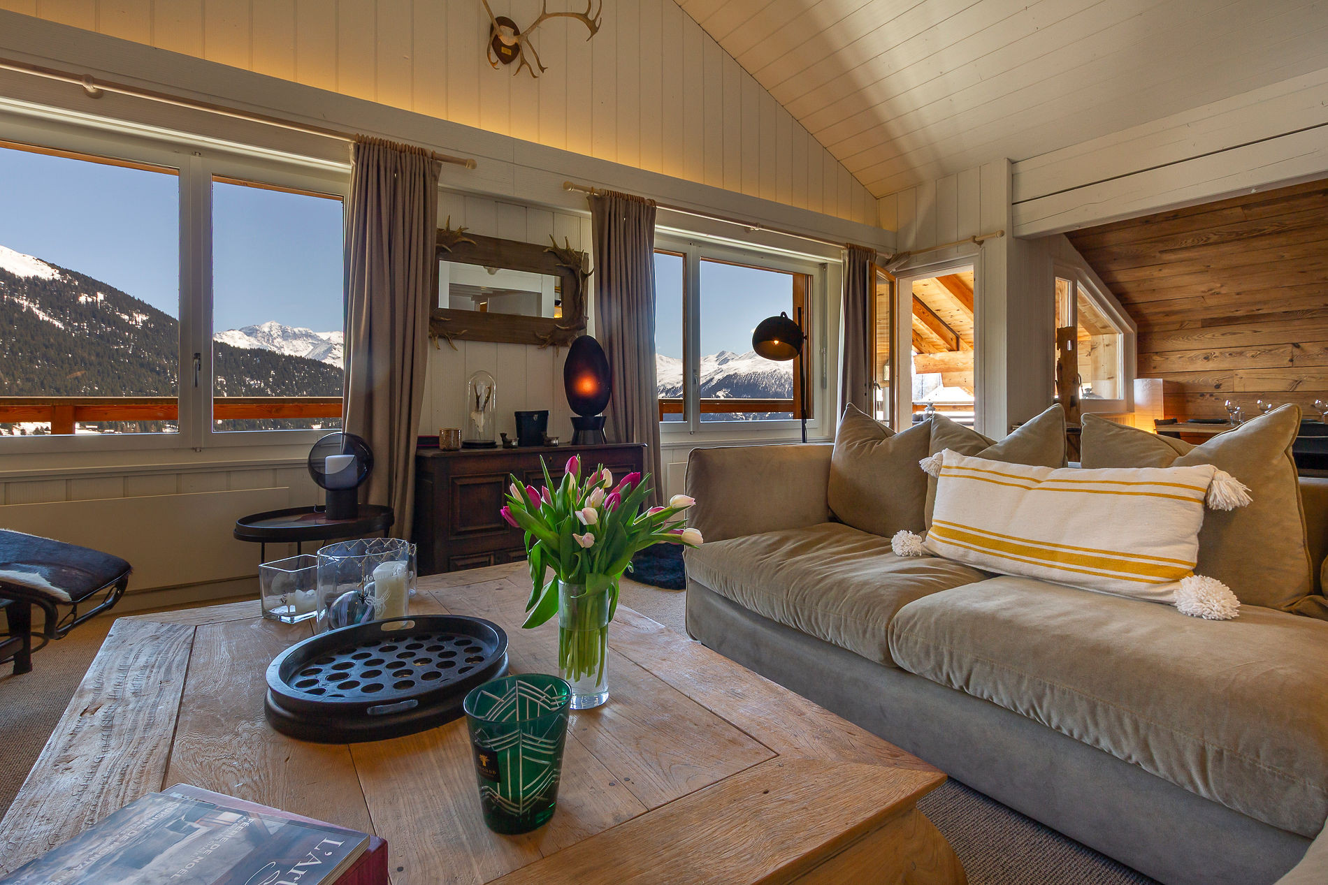Große Fenster durchfluten den Raum mit Tageslicht und bieten einen atemberaubenden Blick auf Verbier und die umliegenden Berge. Dieses Panorama lässt sich auch vom großen, nach Süden ausgerichteten Balkon mit Gartenmöbeln genießen.