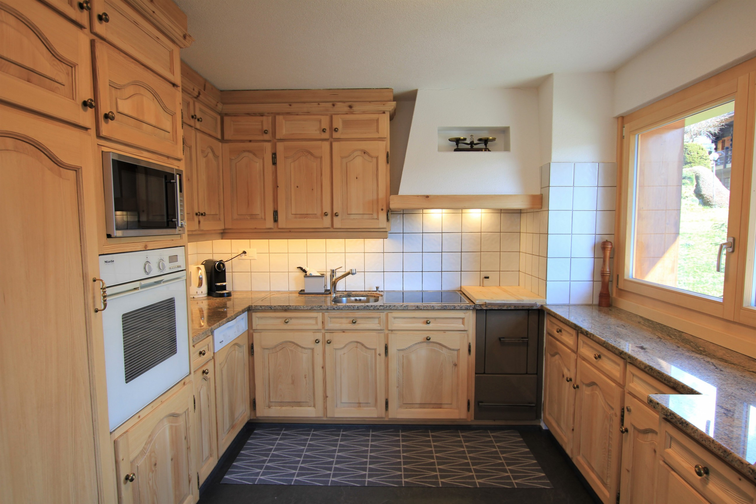 Die vollständig ausgestattete Küche, ein Doppelzimmer, zwei Badezimmer und eine grosser Eingangsbereich mit Garderobe und Schuhtrockner vervollständigen diese Etage. Drei weitere Schlafzimmer und ein Bad befinden sich im oberen Stockwerk.