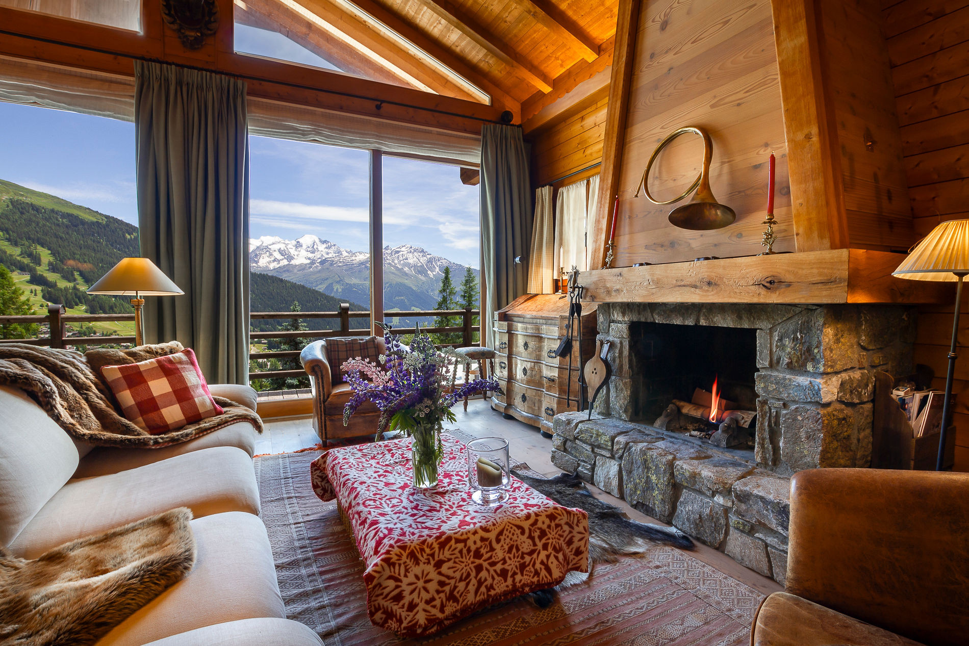 The chalet’s top floor features inviting living and dining areas bathed in natural light from expansive floor-to-ceiling windows, offering stunning views of the Combins massif and the resort. A stone fireplace and plush seatings create a cozy ambiance, perfect for unwinding after a day on the mountain. Traditional alpine décor and rustic furnishing add to the welcoming atmosphere.
