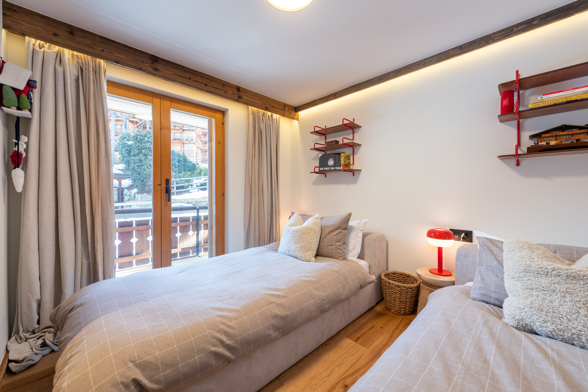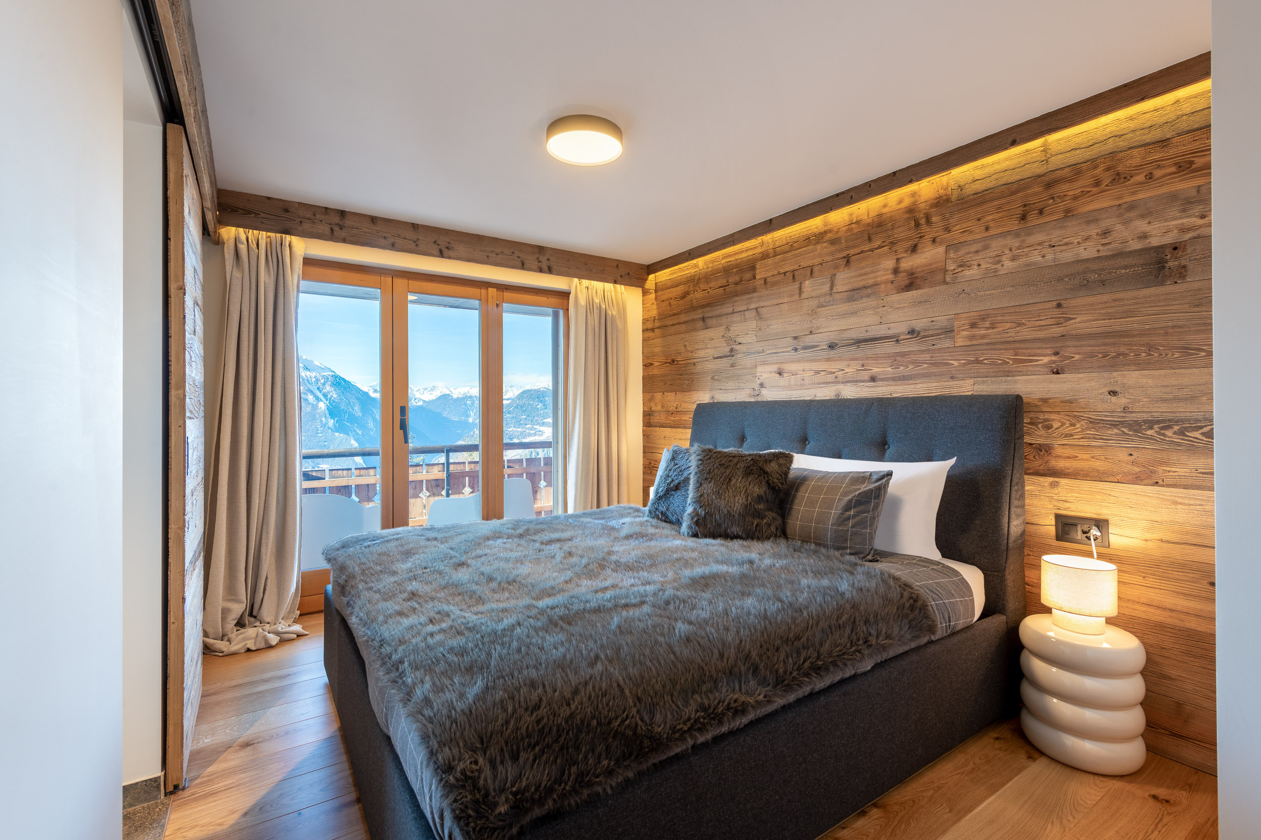 A central entrance hallway leads to three bedrooms. Two of the bedrooms open directly onto the wraparound balconies via elegant French doors, enhancing the sense of space and brightness. The property also includes a highly sought-after underground parking space a rare and valuable feature in central Verbier.