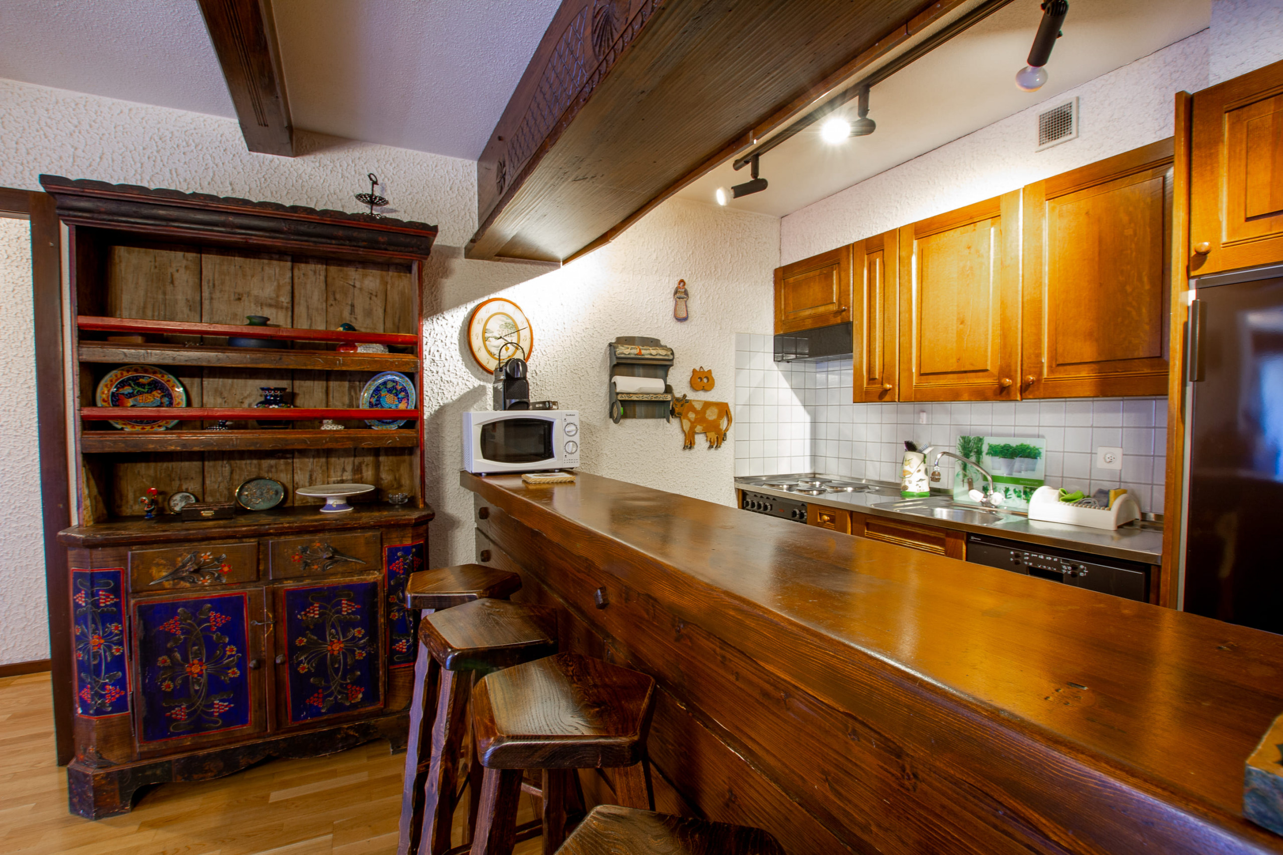 Pin Arole 1 is a great value three-bedroom apartment on the first floor of a traditional timbered chalet. Furnishings are simple but comfortable with a fully equipped kitchen. The location is both quiet and convenient, being on a secondary road 400m from the main lift station at Médran. The south-facing balcony gives spectacular unobstructed views of the mountains.
