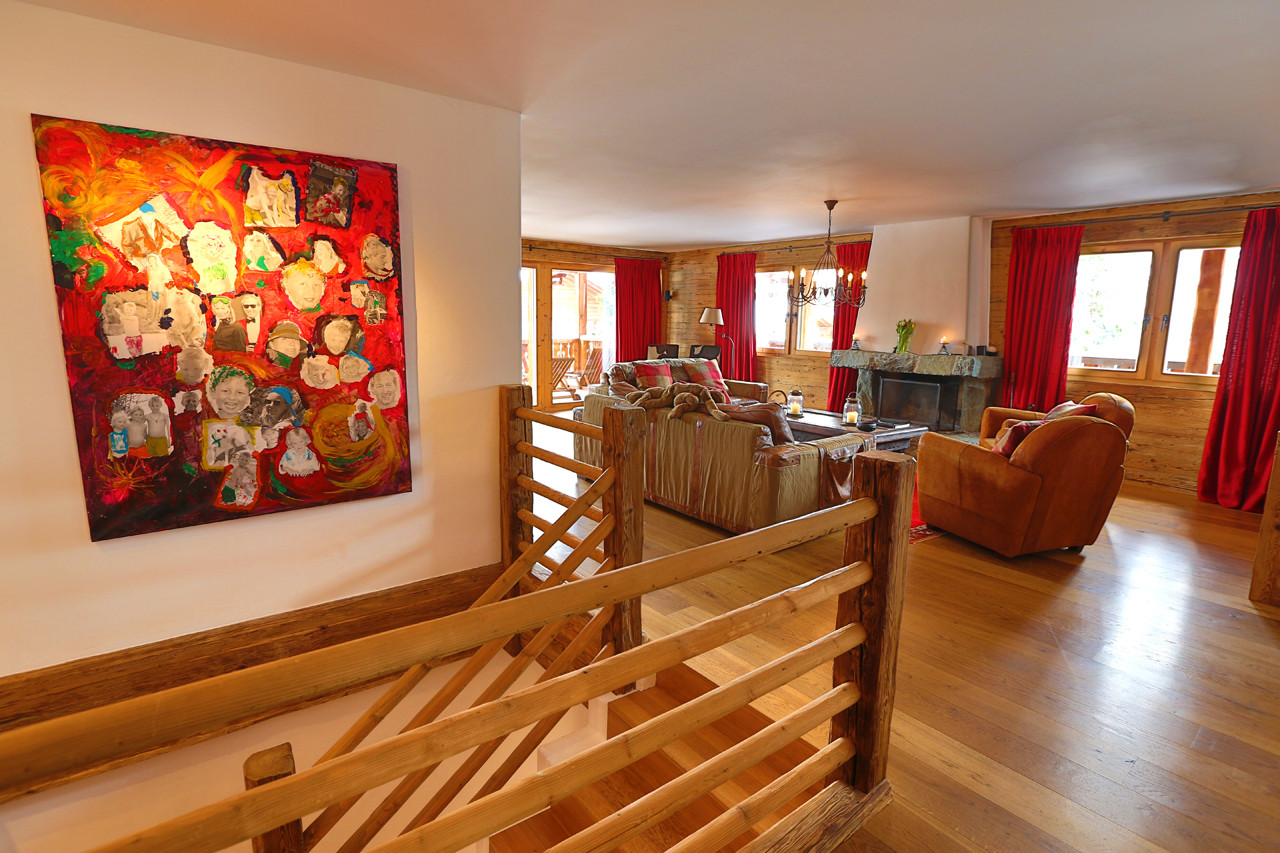 Private lift access leads you into the beautiful apartment set out over 2 floors. On the first floor the open plan living and dining room is wonderfully furnished with hide chairs and old wood finishes (dining room comfortably sits 10 and can be extended). The modern kitchen opens onto the living and dining area. The living room accesses the extensive balcony with views of the surrounding peaks.
