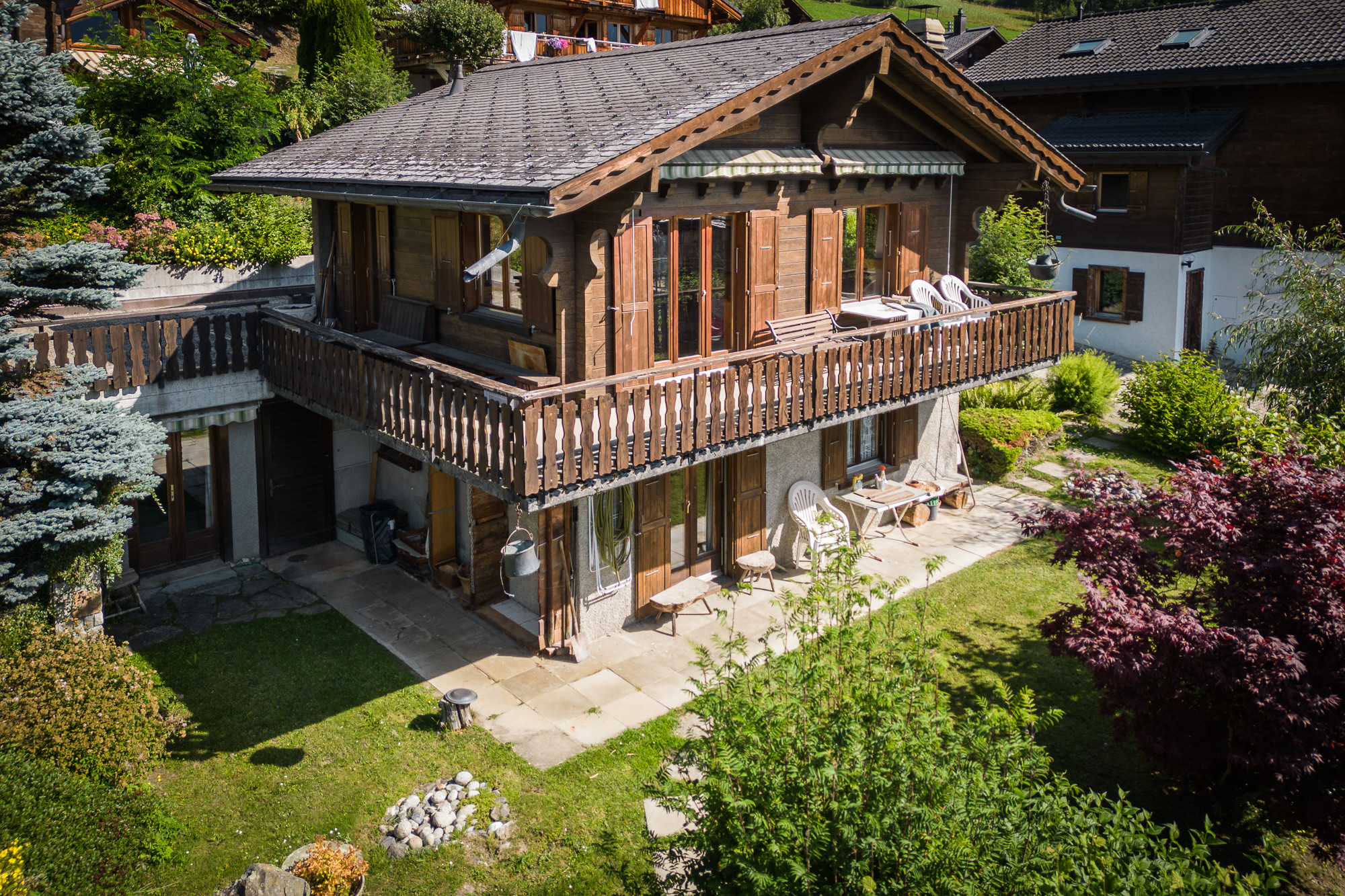 A bus-stop (serviced year-round) can be reached by foot in a couple of minutes, while the chalet remains fully preserved from any noise. All surrounding plots have been built and renovated, so no annoyance is to be expected in the neighbourhood.
