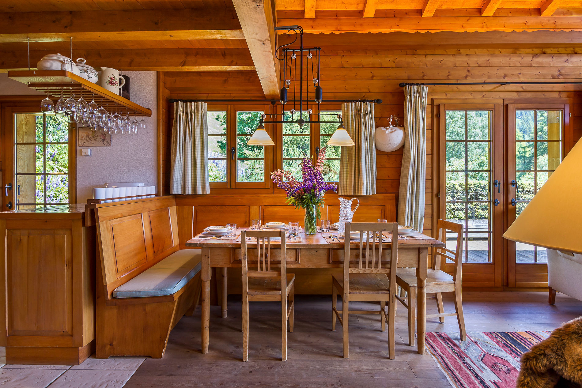French windows open to a south-facing balcony and terrasse, overlooking a spacious alpine garden.