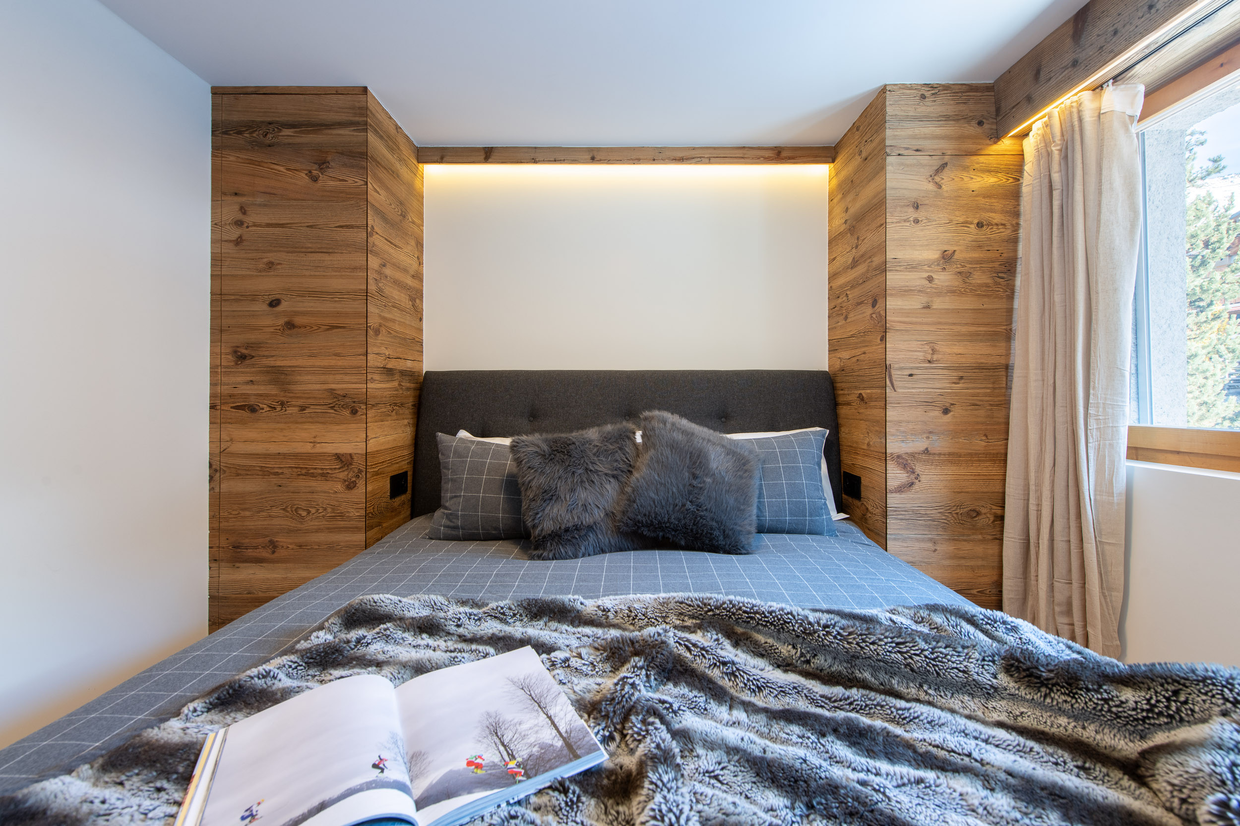 Un hall d’entrée central dessert trois chambres. Deux d’entre elles donnent directement accès aux balcons grâce à de belles portes-fenêtres, renforçant la sensation d’espace et de luminosité. La propriété comprend également une place de parc intérieure très recherchée un atout rare et précieux au centre de Verbier.